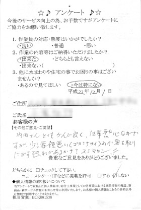 他の業者から「治らない」と言われ「どうしようか?」と困っていた所だったので、治していただいてホッとしました。ありがとうございました。他に困っている人に知らせてあげたい気持ちです。